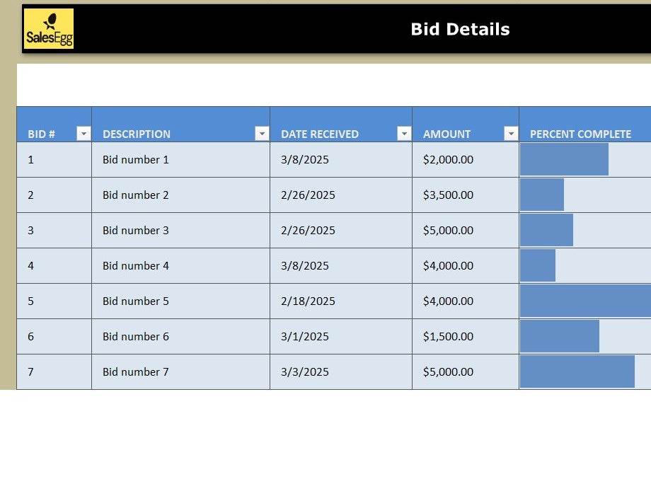 Stay on top of your proposals with this streamlined Bid Tracker Excel Template. Track bid numbers, amounts, due dates, and completion status in a clean, organized layout that updates in real-time. Designed for contractors, freelancers, and sales teams, this template helps you prioritize deadlines, visualize progress, and never miss an opportunity. With automatic calculations and a summary dashboard, it's your all-in-one solution for bid management!