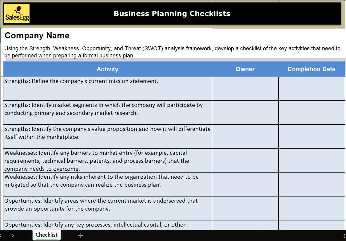 Build a sharper business strategy with BizBoost, the Excel-powered checklist designed to guide your planning with precision. 📋 Based on SWOT analysis, this interactive workbook helps you map strengths, uncover weaknesses, seize opportunities, and prepare for threats. Assign owners, set due dates, and track progress—all in one place. Whether you're launching or refining, BizBoost is the essential tool for business clarity and direction.