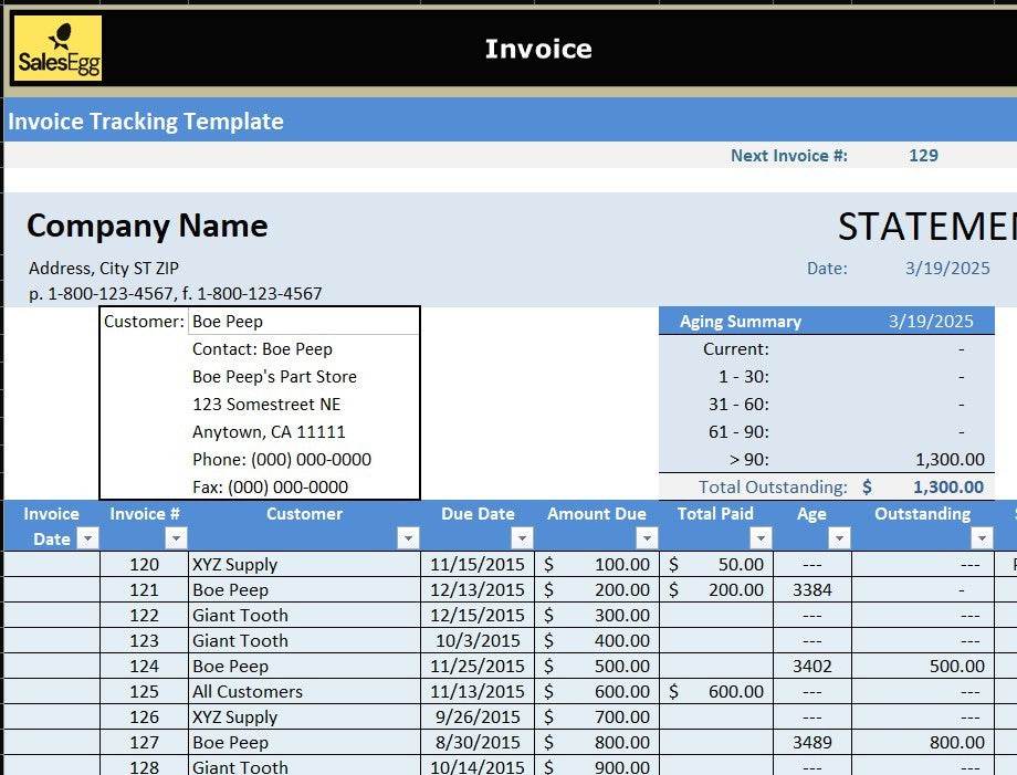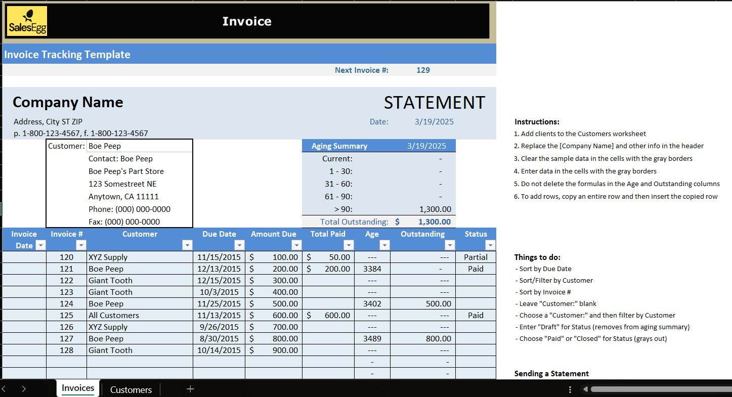 Track outstanding invoices, customer information, and payment status with this powerful Invoice Tracker Excel Template. Featuring linked sheets for customer profiles and invoice records, it helps small businesses and freelancers manage client interactions and cash flow efficiently. With automatic fields for due dates, invoice numbers, and aging summaries, it gives you an instant view of unpaid balances. Cleanly formatted and ready to use, this template simplifies your invoicing process while keeping everything in one place.